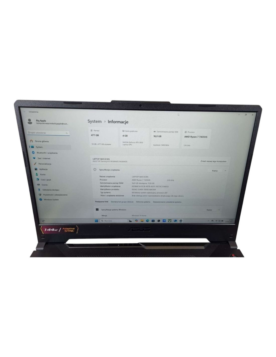 RAM | 512 GB SSD | RTX 3050 | 144 Hz | Windows 11 | KOMPLET | Dowód Zakupu